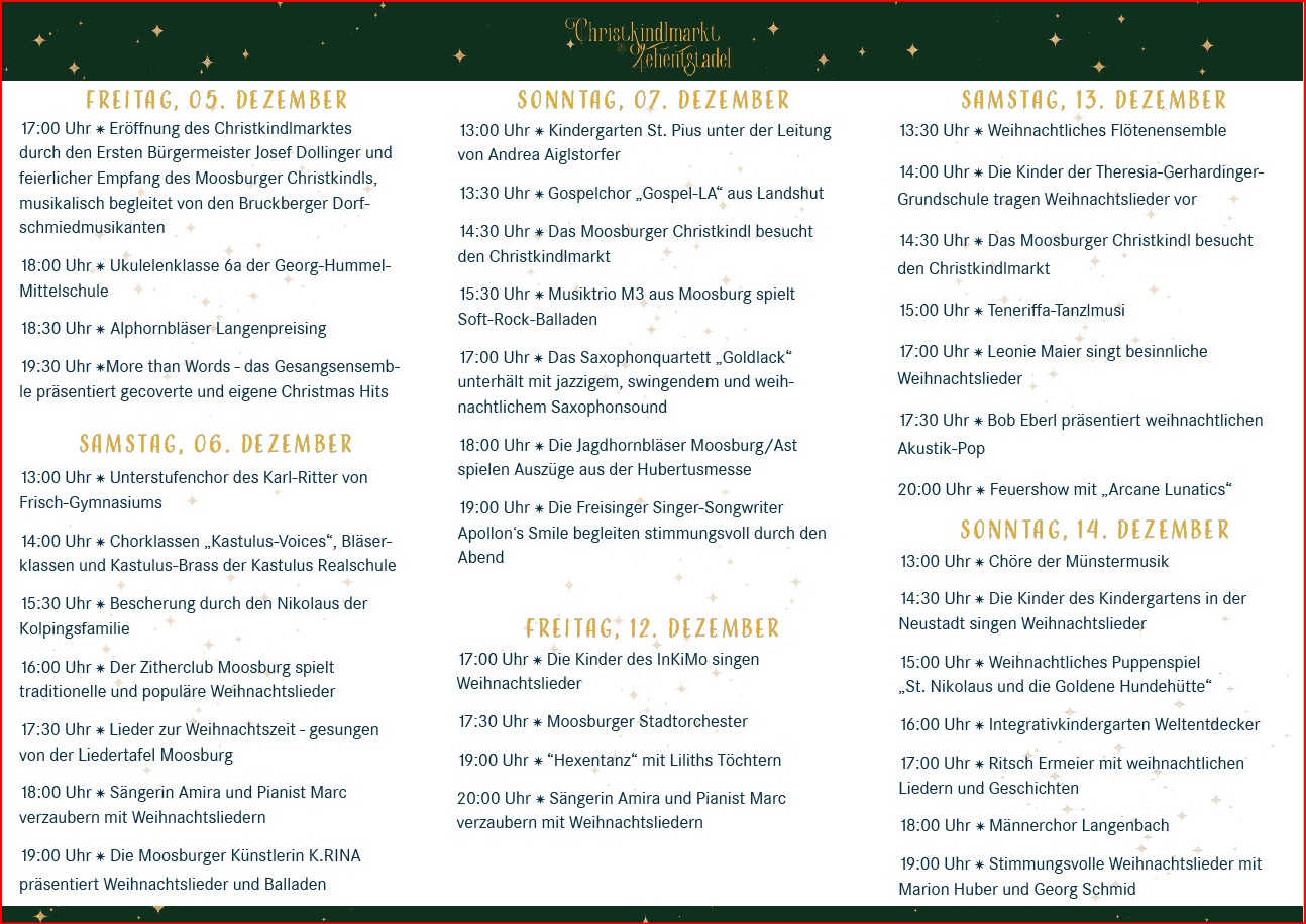 Der traditionelle Moosburger Christkindlmarkt am Zehentstadel findet auch im Jahr 2025 wie gewohnt am zweiten und dritten Adventswochenende statt. Zahlreiche Aussteller präsentieren dort ihre kunsthandwerklichen Waren in festlich geschmückten Buden sowie im stimmungsvoll dekorierten Zehentstadel. Dadurch entsteht erneut ein zauberhaftes, adventliches Ambiente, das alle Besucher in vorweihnachtliche Stimmung versetzt.